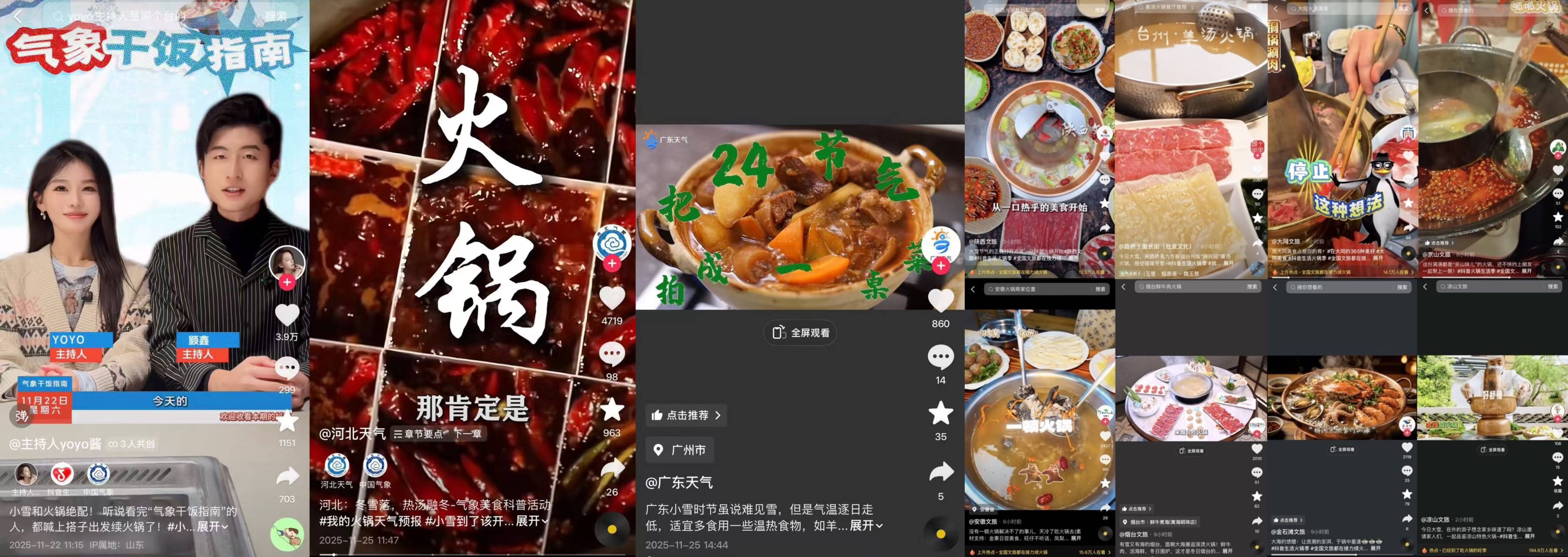 为了让热度持续“沸腾”,活动通过多元化主题内容创作,挖掘火锅消费场景,为商家圈粉更多潜在客群。一方面玩起跨界新花样,联合中国气象发布天气食饮系列科普,携手达人 @主持人 yoyo 酱 推出 “气象干饭指南”,赋予“续火锅”科学的仪式感。还联动@河北天气 @广东天气 等多地气象局发起# 小雪到了该开始续火锅了 互动话题,全网安利当地特色火锅,为本土火锅商家引流精准客群。另一方面,联合安徽文旅、陕西文旅、湖北文旅等发起“火锅交换生”挑战,官方接力推荐本地特色锅底,@七舅脑爷、@温暖一家、@牛哥不牛 等“交换生代表”,生动演绎南北火锅的创意混搭吃法, @密子君、@浪胃仙 则深入探索小众特色食材,一起为全网吃货解锁火锅界的隐藏副本,吃出“不一样”的沸腾体验。不仅将一些地域性较强的火锅商家推向全国视野,也为吃火锅贴上了“有趣”、“有料”的内容标签,充分调动年轻人“续锅”兴趣。