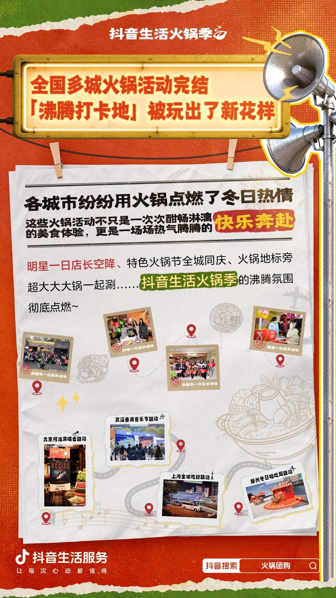 线上热度高涨,线下同样精彩纷呈。「抖音生活火锅季」联动大牌火锅商家在全国多地打造大型火锅局,邀请“沸腾合火人”们打卡“多城沸腾”火锅图鉴,挖掘更多宝藏火锅好店。从北京到南京,刘冠佑、刘维等明星“一日店长”空降多地火锅店,花式宠粉互动;在上海,火锅季特色小车穿梭街头带你逛吃魔都;在重庆,万人火锅派对尽显世界火锅之都的魅力……一场场精彩的活动,将线上流量转化为线下销量,让火锅生意更“沸腾”。