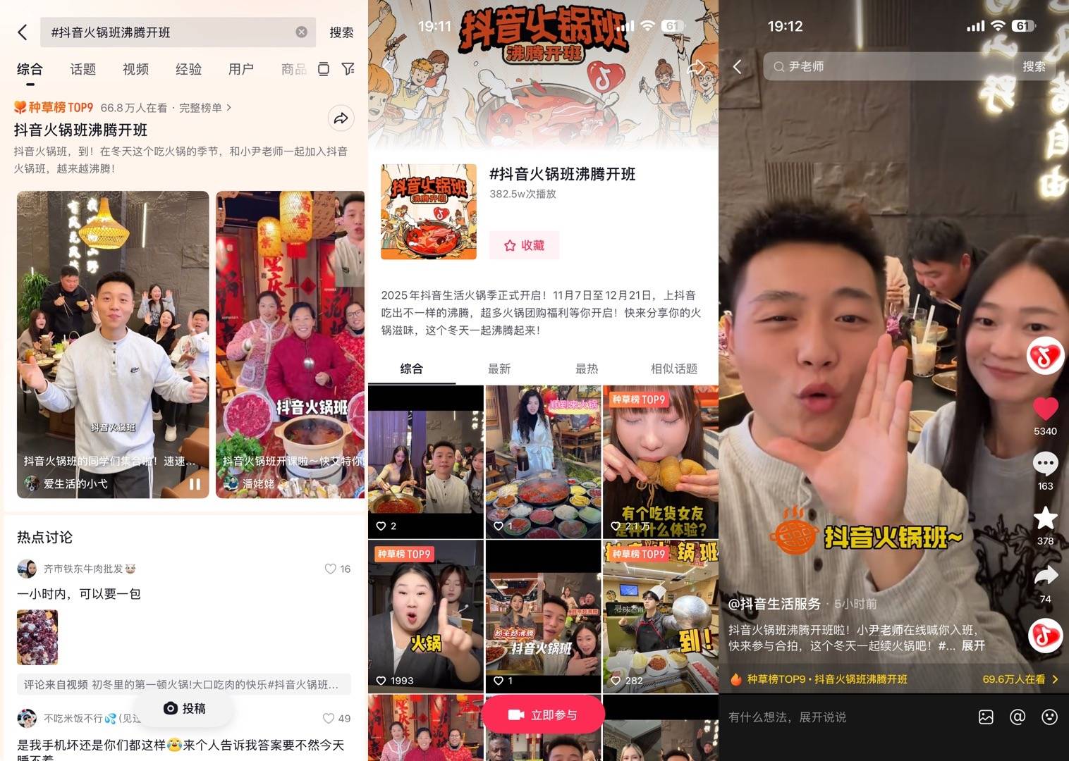 想要活动进一步引爆,戳中年轻人的喜好很重要。借势抖音音乐班热度,打造“抖音火锅班”,由音乐达人@小尹老师 带头“开班”,就连新东方的专业师生都来报到。@潘姥姥、@叶欣壹 等人纷纷化身“班委”,用火锅版社恐挑战、蘸料PK大赛等趣味内容“整活”,将吃火锅变成一场好玩、可分享的社交游戏。随着#抖音火锅班沸腾开班 话题强势冲上抖音热点榜,评论区里 “求同款门店地址” 的呼声此起彼伏,为商家销售转化带来了更多可能性。
