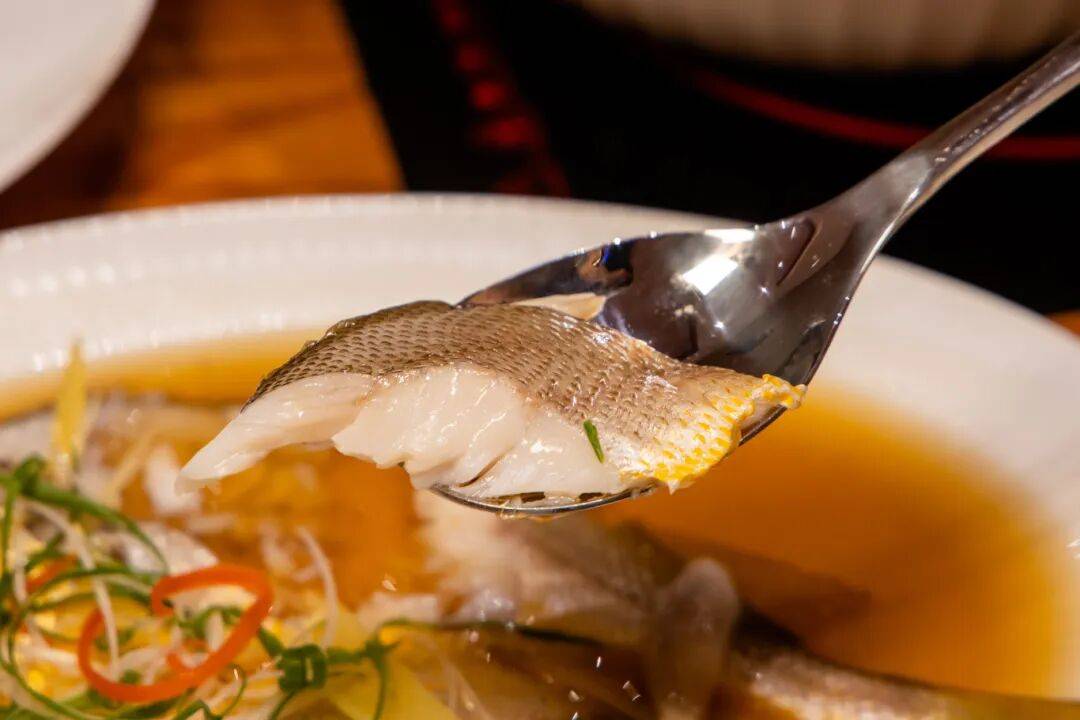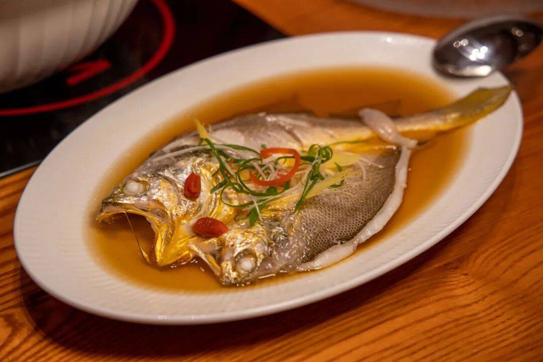 选用海钓海捕黄鱼,盐粒锁住鲜味,搭配姜葱、料酒清蒸。蒜瓣肉入口即化,咸鲜中透出大海的甘甜。看似简单的一道菜,却是对厨师的大考验,腌制、蒸的时间都要根据每条鱼而异,不然就是对食材的浪费。