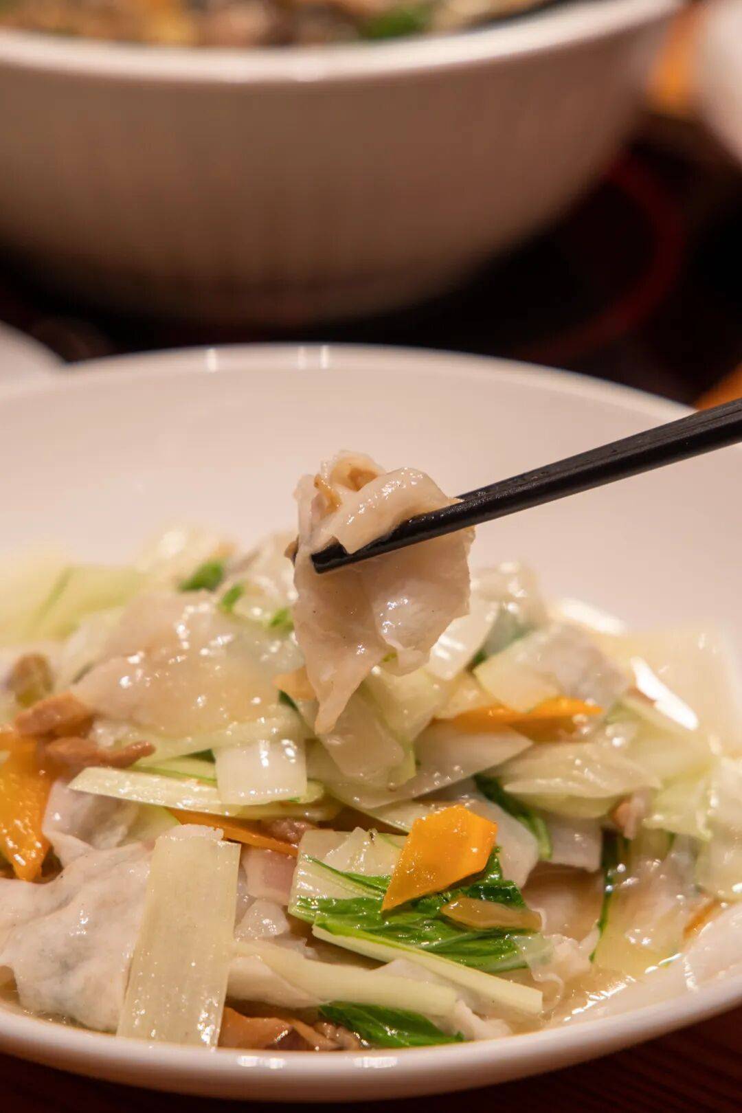 温州敲鱼以鮸鱼为魂,需经“三敲三汆”方成佳肴。鱼肉裹淀粉后,以木槌敲击成鱼片,入沸水汆熟后与白菜、榨菜共烩,敲鱼片呈半透明状,入口弹牙爽滑。