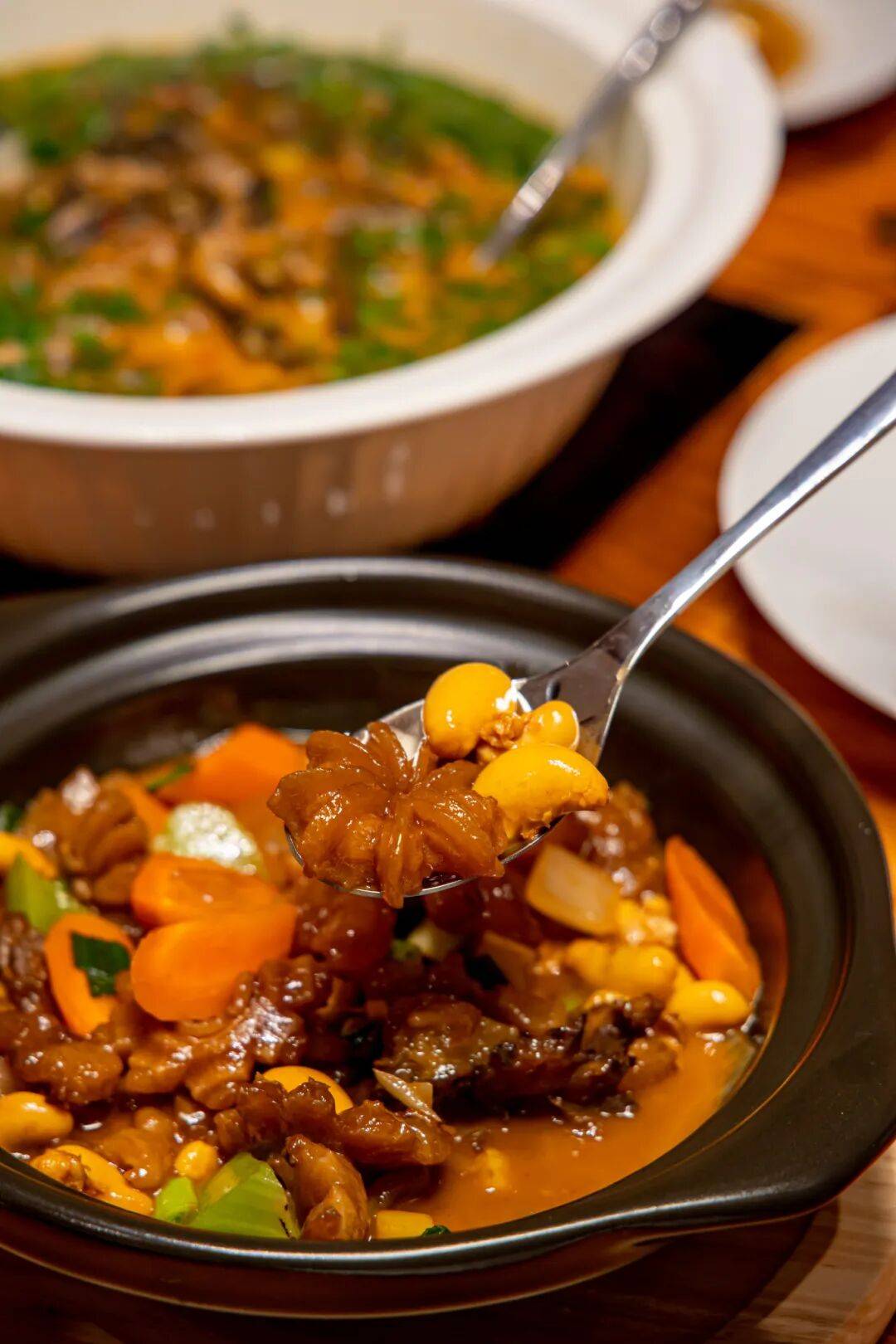 牛鞭胶质丰盈,鸡腰嫩滑如脂,汤汁浓稠似琥珀。这道菜源自传统药膳,牛鞭的温补与鸡腰的滋养相得益彰。烹饪时需以小火慢煨数小时,方能成就“胶质缠绵,滋味醇厚”的养生佳肴。