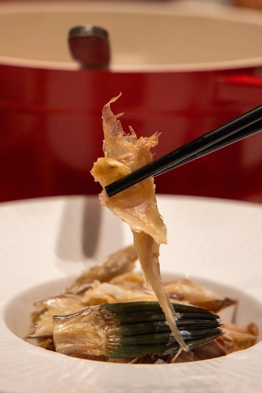 席中冷盘都很有温州特色,这道绿鳍剥皮鱼干最令我中意,以绿鳍马面鲀为原料,经去皮、去内脏后自然日晒而成,其肉质鲜美,无小刺,鱼腥味淡。
